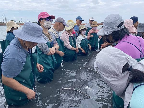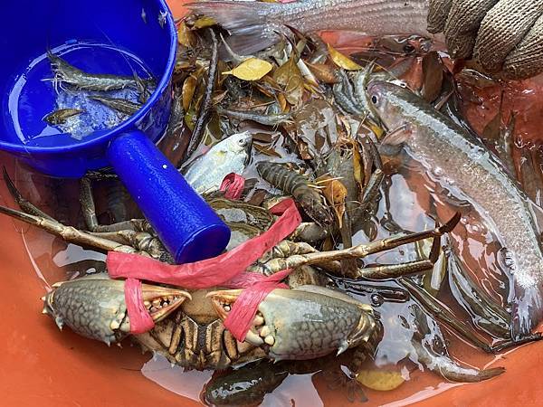 後來我們親自下海跟著他去抓魚,穿著青蛙裝,下海踩在軟軟的泥土上,很怕跌進海裡,是超刺激的體驗,而魚籠一解開,在大家的期待和歡呼聲中倒出魚蝦蟹,是活動的最高潮!