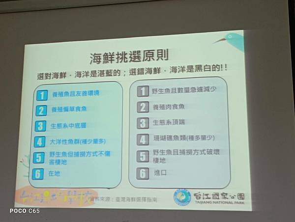 回到岸上,台江濕地學校為我們上關於「海鮮挑選原則」的課,說明海鮮盡量選購在地、中小型、數量多非保育的品種,否則2048年即將面臨沒魚可吃的窘境。