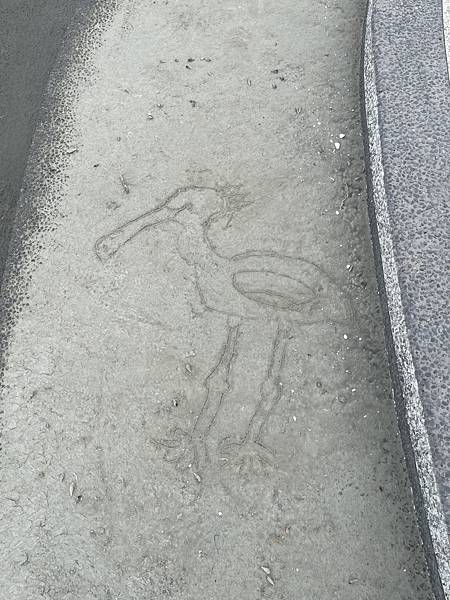 剛剛我們下海抓魚的時候,因為他身高不夠,沒辦法一起穿青蛙裝下海,無聊的他就在岸邊畫畫,用石頭在沙子上畫一隻「黑面琵鷺」和其他生物,工作人員拍給我看,也是很感人。